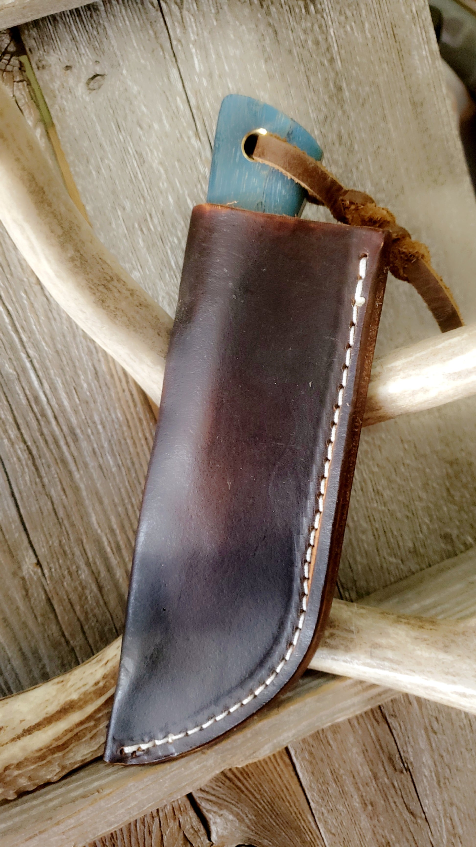 3.25 drop point hunter made from vintage sawmill blade with blue died spalted hackberry comes with leather pocket sheath
